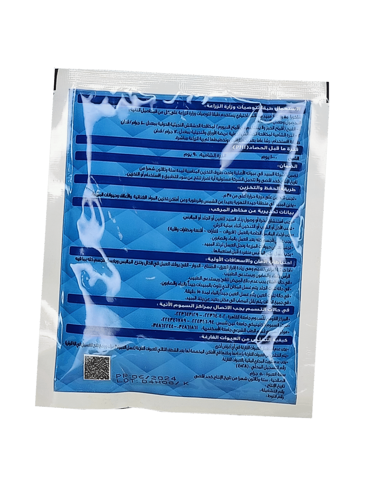 المستحضر فى صورة حبيبات قابلة للانتشار فى الماء يحتوى الكيلوجرام منه على 850جرام مادة فعالة